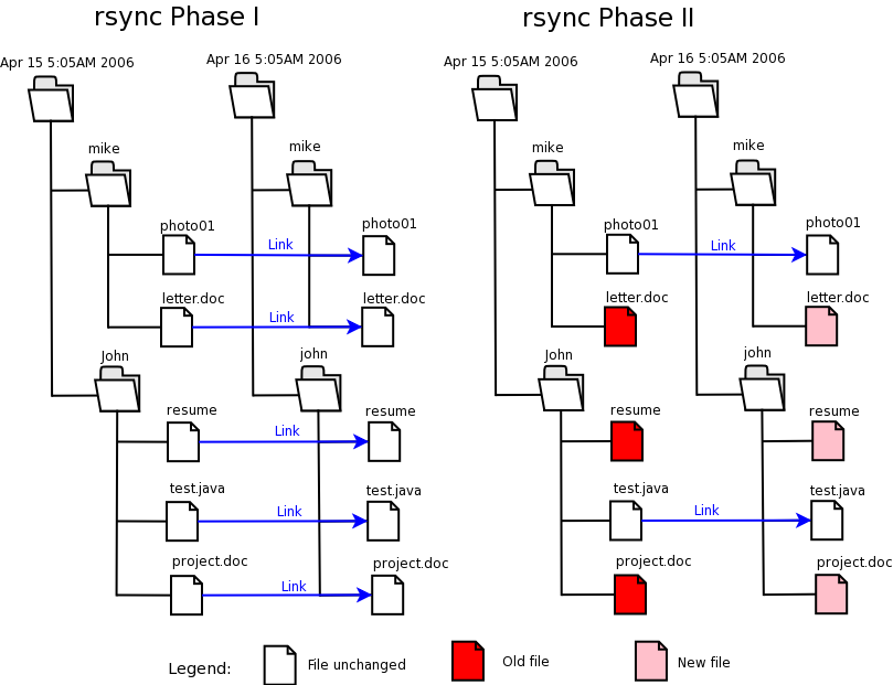 Näiteks: aktiivses töötavas süsteemis on kaust nimega “andmed”. Backupi serveris on kaust “andmed-2014-02-10″ ja täna tehakse kaust “andmed-2014-02-11″. Rsyncile öeldakse ette: Töötavast süsteemist kopeeri kaust “andmed” backup serverisse nimega “andmed-2014-02-11″ ja kontrolli faile kaustaga “andmed-2014-02-10″. Sellisel juhul tekitatakse nagu kolmnurk, mille abil võrreldakse faile ja sellisel juhul tehakse lingid.